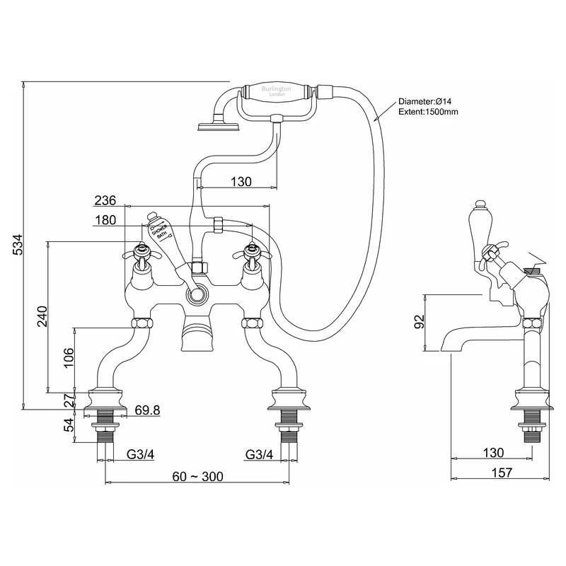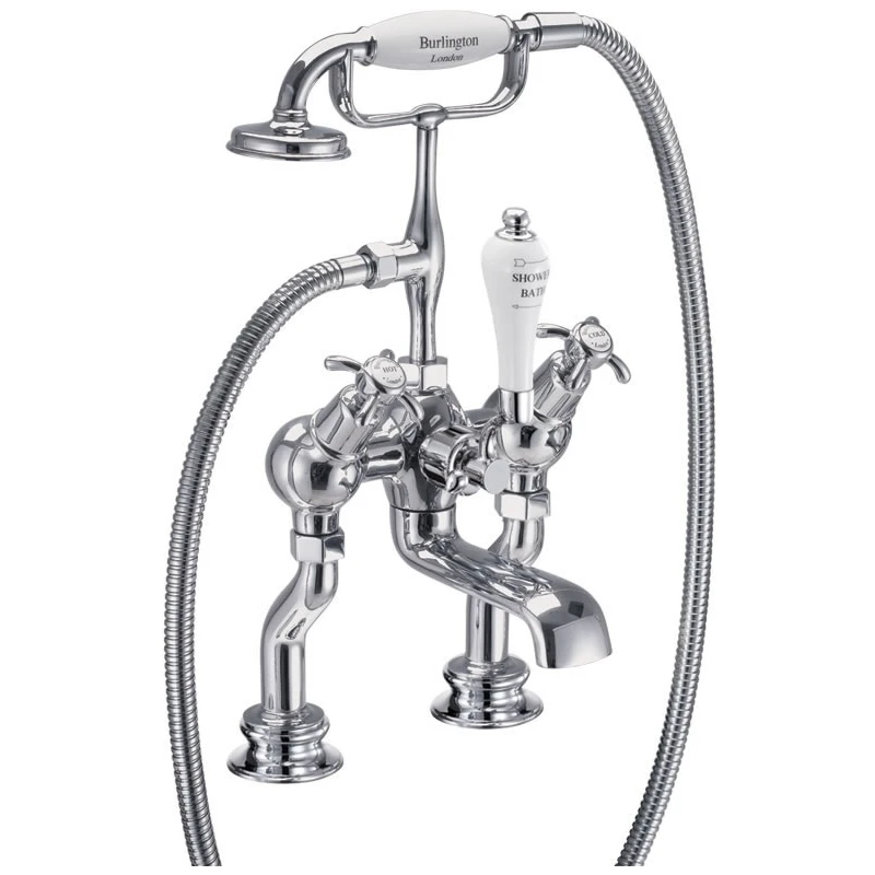 Consists of 1 x Angled bath shower mixer (Including the standard cradle, ‘S’ adjuster, Claremont, Anglesey & Birkenhead divertor handle, hose, ceramic telephone handset , excluding tap heads, base and unions) (T9), 1 x Deck mounting unions (for Bath Shower Mixer & Bath Filler, 3/4) (T18), 1 x Anglesey tap handles (pair) (T2) and 1 x Regent large pair of tap bases (for bath taps, bath shower mixers & bath fillers – pair) (T4A)