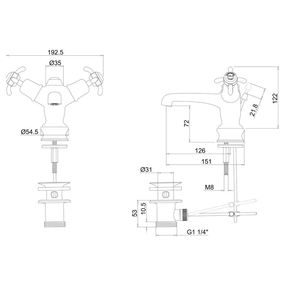 Consists of 1 x Basin mixer with pop up (T12), 1 x Anglesey tap handles (pair) (T2) and 1 x Regent small single tap base (T4B)