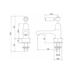 Consists of 1 x Quarter Turn Basin Mixer , with pop up (excluding tap heads & base) – Nickel (T12-QT NKL), 1 x Regent small single tap base (for Basin & Bidet monoblocs – single) – Nickel (T4B NKL) and 1 x Claremont tap handles (pair) – Nickel (T1 NKL)