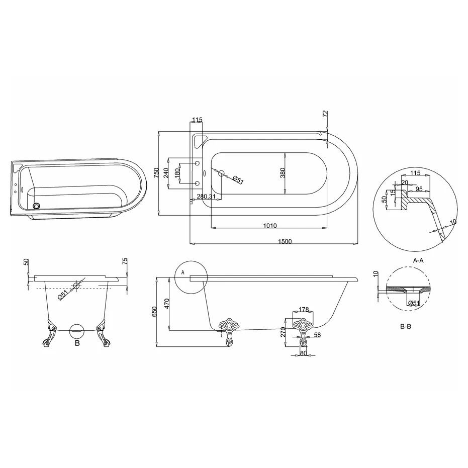 Consists of 1 x Traditional leg set in chrome (E11 CHR) and 1 x Hampton shower bath LH (150cm x 75cm) (E20)