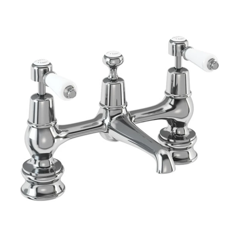 Consists of 1 x Kensington tap handles (pair) (T4), 1 x Regent small pair of tap bases (T4B-2) and 1 x Quarter turn bridge basin mixer with plug & chain (T16-QT)