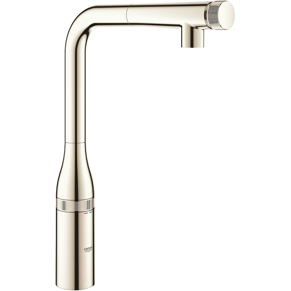 Essence SmartControl tap with useful pull-out spray head – push to start, smooth to adjust, perfect for busy kitchens. Take control with the lightest of touches – the Grohe Essence SmartControl tap can be operated at just the push of a button. The sleek, delicate design is intended for single hole installation. Thanks to the innovative SmartControl feature you can start and stop the water flow with just the push of a button. Turn to adjust the volume, from water-saving eco mode to full flow. You can even turn it on hands-free with just a press of your wrist or elbow. The temperature is easily adjusted via the mixing valve on the tap?s body. This tap leaves lots of comfortable working space for filling large pots or vases under the high L-shaped spout. The spout swivels through 140°, ideal for larger or double sinks. The pull-out spray head with laminar adds to the flexibility, making it easy to prep veg or clean the sink without splashing. Grohe Magnetic Docking means the spray head retracts smoothly back into place once you are finished. With Grohe QuickFix Plus rapid installation system with flexible connection hoses you can be confident of a swift and simple fitting process. This monobloc kitchen mixer tap also features a tactile and durable Grohe StarLight coating using physical vapour deposition (PVD) for an extra level of scratch-resistance.