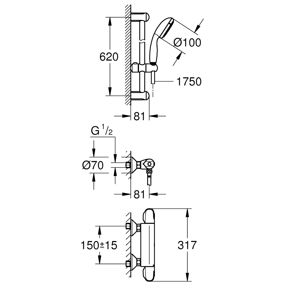 Grohtherm 1000 Thermostatic Shower Mixer 1/2″ with Shower Set, Chrome finish