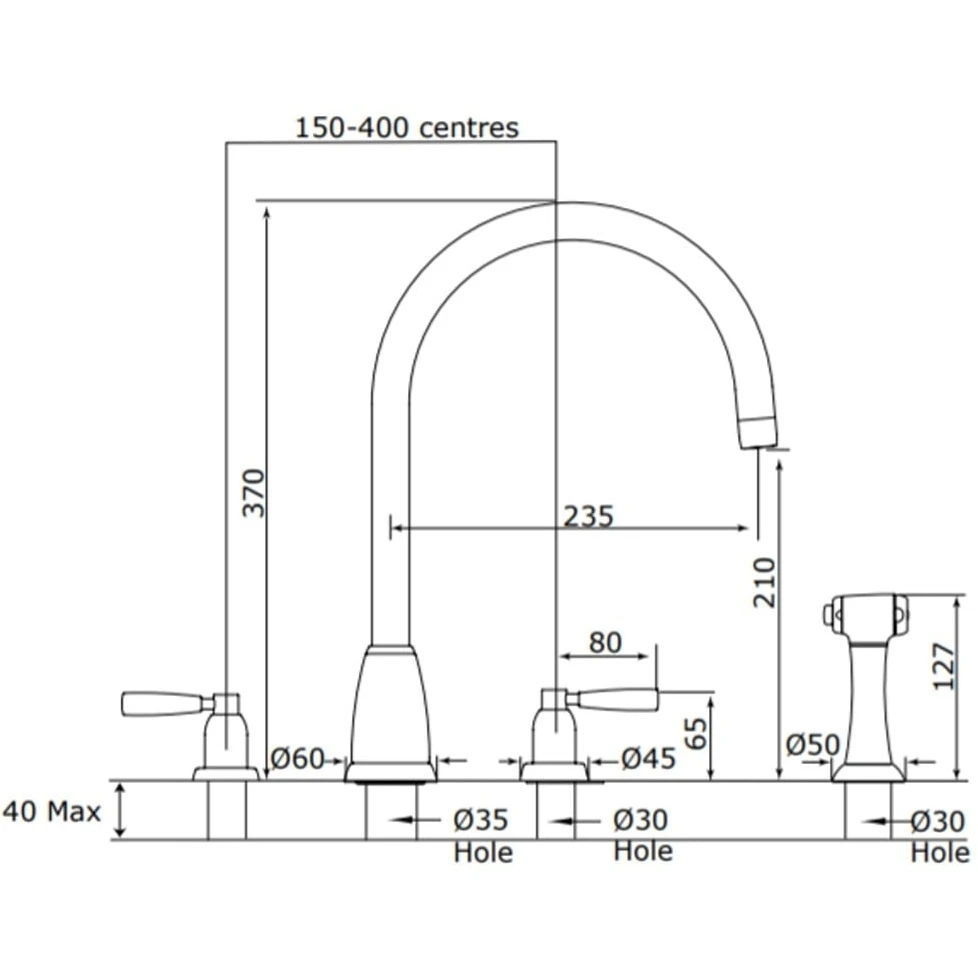 Callisto Four Hole C Spout Kitchen Sink Mixer Tap with Lever Handles and Rinse