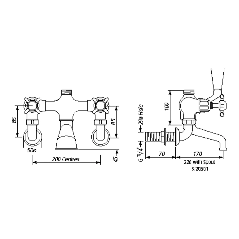 Bath/Shower Mixer with Wall Unions and Crosshead Handles